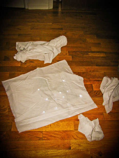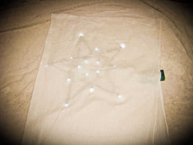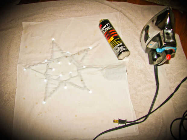 d. Tire de la tela con la mano fuera y dos interiores de la tela de unos 8-10 pulgadas lejos del aerosol. Cubrir la parte de que la estrella es imposición y la parte que está por encima de él. Cobertura de luz con la técnica básica de la aerosol-pintura. Barrido rápido en una dirección.
