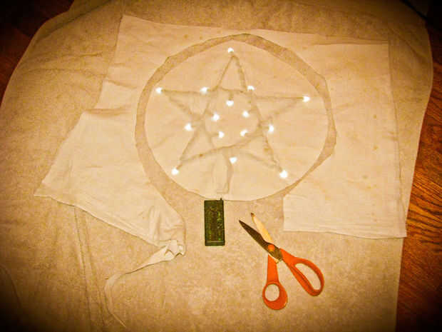 Corte ahora. Uso de tijeras. Busque los cables! ¿En serio, usted puede cortar un alambre entonces tendrás que buscar un instructable para empalmar cables y entonces donde va a ser? Cortar un círculo en primer lugar. Reflexionar sobre el círculo. ¿Puede dejar como un círculo, pero sería más como una estrella? Cortar una estrella con curvas. Una estrella con curvas se corta haciendo grandes sonrisas los puntos y luego redondear los puntos. Ser perfectish.