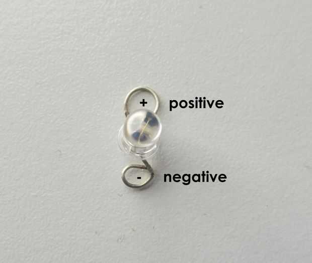 Gire las patas del LED en los lazos para hacer el LED sewable: hacen la pierna más larga en un lazo más grande para indicar que es positivo.