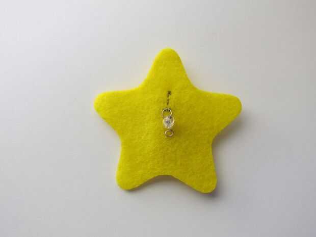 Colocar el LED en la estrella. Coser la pata positiva del LED a la estrella con hilo conductor y conecte con el lado positivo de soporte de la batería. Corte el hilo.