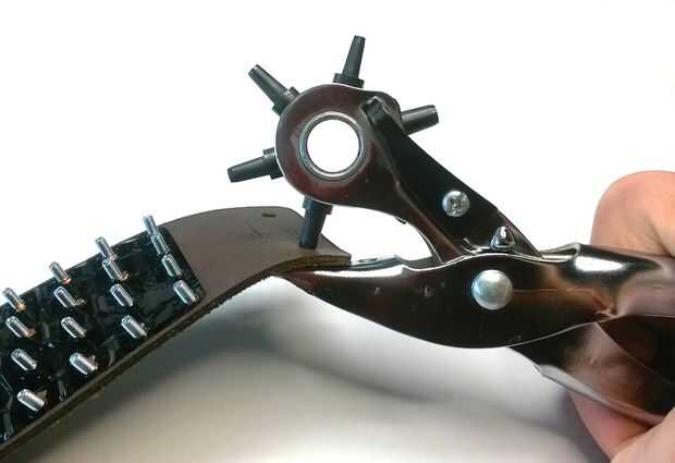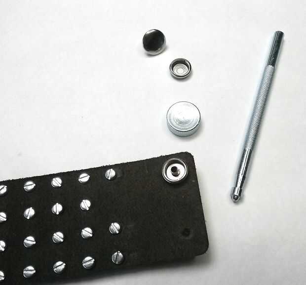 Los cuatro encajen los agujeros será de aproximadamente 0,4" de los bordes superiores y laterales en cada esquina de la piel. Esto deba ajustarse al individuo. Marque la ubicación de los dos agujeros en un extremo. Seleccione el tamaño correcto golpe de sus broches de presión y perforar los dos agujeros con el punzón de cuero. Traslape el collar como será cuando se desgasten y use los agujeros que usted simplemente perforado para marcar las ubicaciones de los orificios en el otro extremo. Perfore los agujeros.