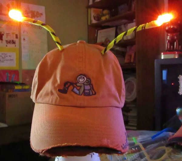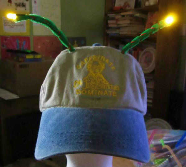 La génesis de esta idea comenzó en una quedada de hacer revista en San Francisco. Se había movido el viejo edificio de Exploratorium e invitó al público a celebrar el nuevo espacio. Siempre pizza, refrescos, cerveza y un montón de 10mm LEDs de varios colores, pilas CR2032 y conducto de cinta y luego dijeron tienen en él. Mi hija cubrió su cuerda de seguridad, poner a los alumnos en un hoodie de facial Neffy me instaba a poner mi sombrero. Parecían pequeñas protuberancias encima de gorra. Después de esa noche me puse la tapa alrededor durante semanas. En el tiempo que la cinta comenzó a dar forma, constantemente se pegaría a mi pelo, y parpadean los LEDs encendido y apagado. También durante este tiempo los niños y algunos adultos fijamente ellos, preguntar lo que eran o identifican inmediatamente una antenas y preguntar cómo funciona.