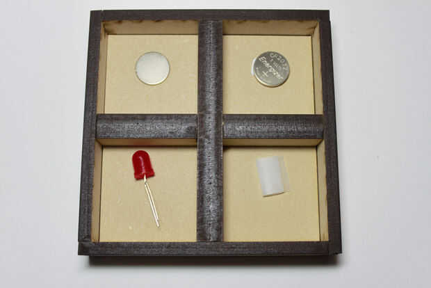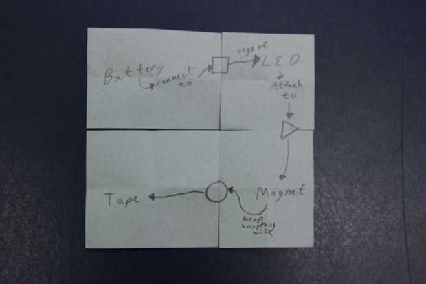 Materiales:2 x Tarjeta de papel (Manila) se desliza1 x 2032 batería de reloj1 x 10mm difusa LED1 x imán de tierras raras (neodimio)Cinta (eléctrica o cinta aislante)Paso 1: Hacer que el LED enciende para arribaTocar los extremos del LED a la batería