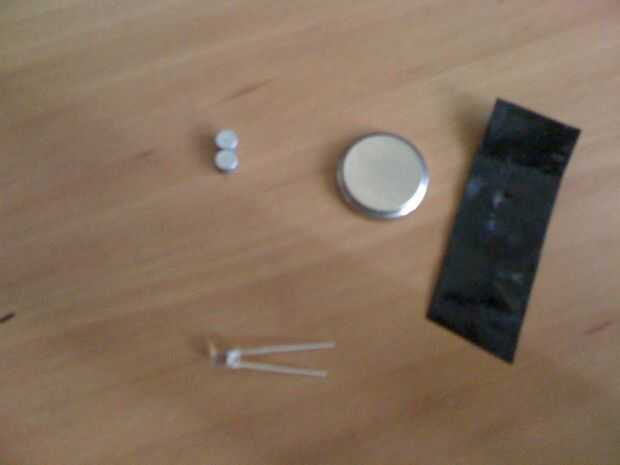 todo lo que necesita es un led de cualquier color o tamaño, una batería de 3 voltios y un imán de cualquier clase y alguna cinta aislante