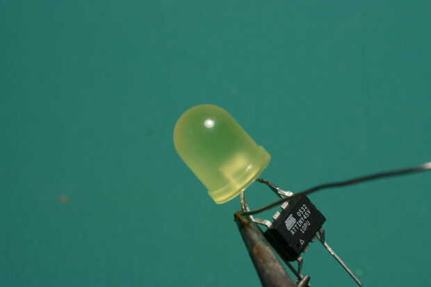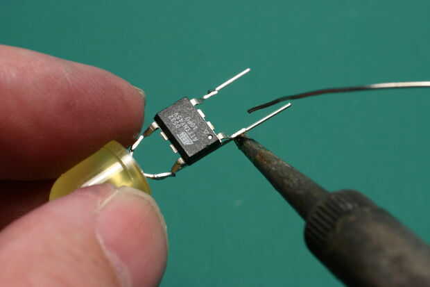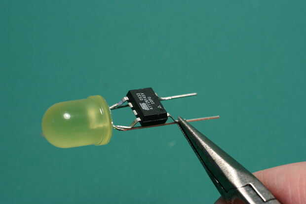 El chip se programa de manera que podemos soldar los cables del LED en el chip. La mejor manera de soldarlos juntos es una cara con nariz nedle plyers y toque el otro lado con alguna soldadura.
