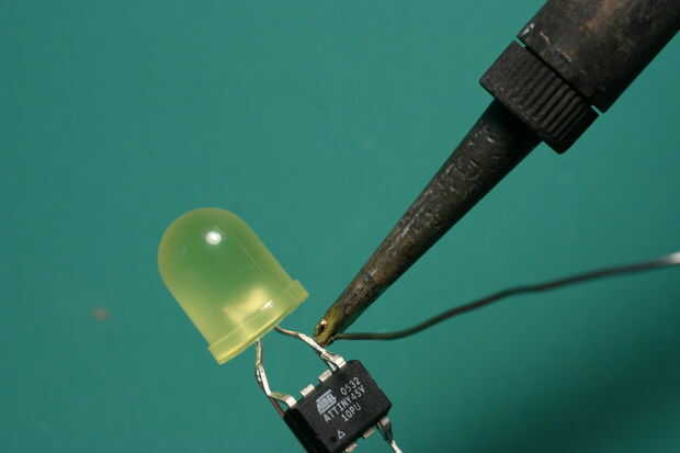 Debe soldar el cable de LED más "vcc" (energía) y 'rst' pins del chip. Esto cortocircuitos el reset del chip y le da una conexión más segura. Asegúrese de que el diagrama de cableado en este paso para obtener los pines correctos de referencia.