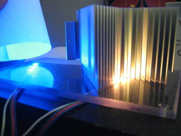 Construido utilizando un 24 canal alta corriente LED controlador USB para controlar la luz de tira del RGB LED de 12 voltios, en 8 grupos separados. Cada grupo tiene los PWM de 8 bits que puede crear más 16 millones de colores. Y es conducido en comp