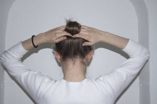 Bajo el lazo de cola de caballo hay un agujero oculto en el donut. Suavemente separó el pelo por encima del agujero y empezar a meter en el lazo del pelo...