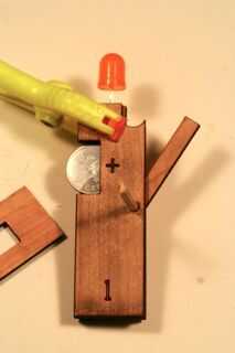 Diapositiva de la batería y el interruptor del brazo en su lugar - aún sin pegar.  El LED deberá encenderse cuando el brazo del interruptor está cerrado.  Si no es así, presione la vela alrededor de la batería y el brazo del interruptor.  Añadir la otra abrazadera por debajo de la batería y ver si eso ayuda.  Si absolutamente no consigue el LED a la luz, echa un vistazo a la etapa de