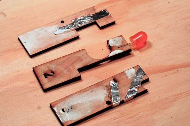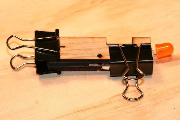 Cuando estés seguro de que todo funciona, desarmar las partes por lo que se puede aplicar el pegamento.   Pega las piezas 1, 2 y 3 junto con el LED y sujetarlos mientras se secan.  La pinza es muy importante - las capas deben ser apretados para deje que los contactos eléctricos.  Coloque una abrazadera en la parte superior alrededor de las patas del LED y una segunda abrazadera debajo del compartimento de la batería.