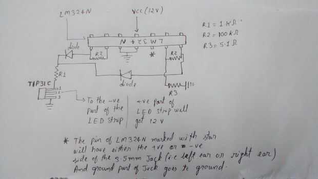 materialesTablero de pan grande2 transistores TIP31c (o transistores PNP equivalente)8 LEDs de cualquier color3 llano marcos1 hembra 3.5mm audio jackUn adaptador de corriente, de 9 a 15 voltios debe estar bien (tal vez su viejo cargador de móvil)Cint