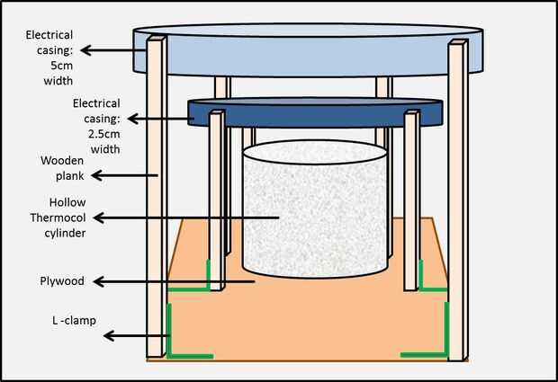- El interior la mayoría de la capa es un cilindro themocol con tiras de LED rojo pegado a la parte inferior en forma de un círculo. Otra capa se pega en la parte superior del cilindro.