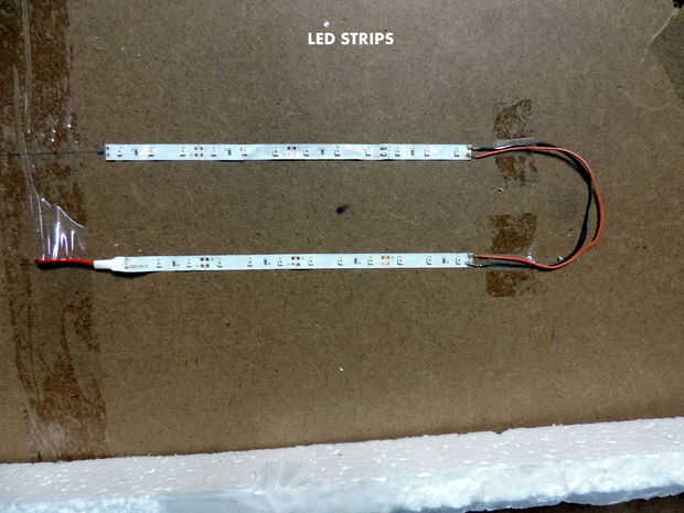 - Tiras de LED de la Stick de 20 cm de cada uno en dos filas cada 5 centímetros aparte. Las columnas finales son color rojas, luego azul y las medias columnas son de color verdes. Todas las piezas de las tiras en un segmento son en paralelo. Los cables del ánodo y el cátodo están conectados a la regleta. Los negativos de las tiras más adelante se conectará a la salida de TLC5916.