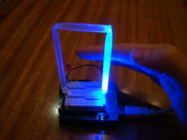 Ahora que ya tenemos algunos ingeniosos LED sensores (aka - normal LED) es el momento para hacer algo. Hacer un boceto rápido de Arduino que se enciende un LED cuando se pone oscuro. El código es muy sencillo; Cuando el voltaje de lo LED Sensor va debajo de un nivel Arduino sabe es oscuro y se enciende un LED. Usé a los brillos super rojo para los sensores porque tenían la mejor gama (IR era demasiado sensible).
