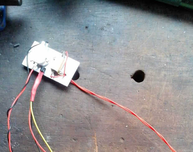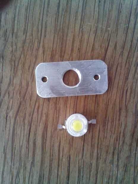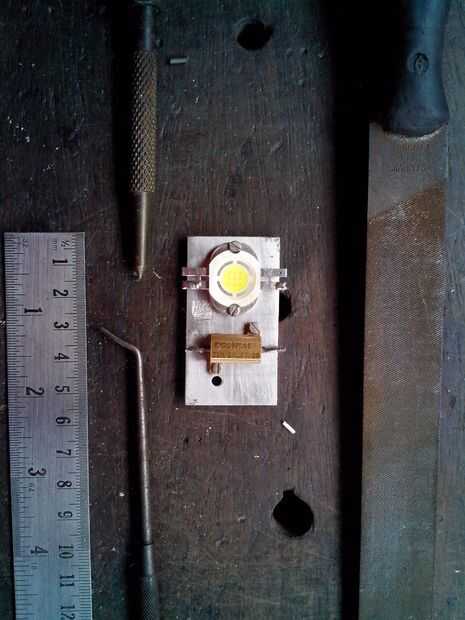 Primero un pedazo de hoja de aluminio aproximadamente 55 mm por 30 mm debe ser formado. Afijo del sensor de temperatura, LED de potencia y resistencia de potencia a la placa de aluminio con tornillos o con adhesivo térmico si es necesario.