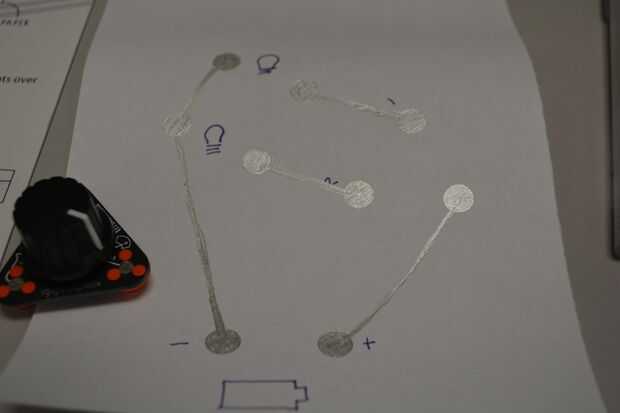 En primer lugar, marcar la 'huella' de cada pieza, rellenar cada círculo con tinta conductora. A continuación, establecer las conexiones entre módulos. Asegúrese de que sus conexiones son sólidos - un lugar con tinta insuficiente no conducirá electricidad.