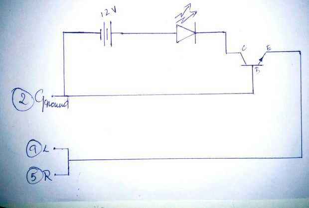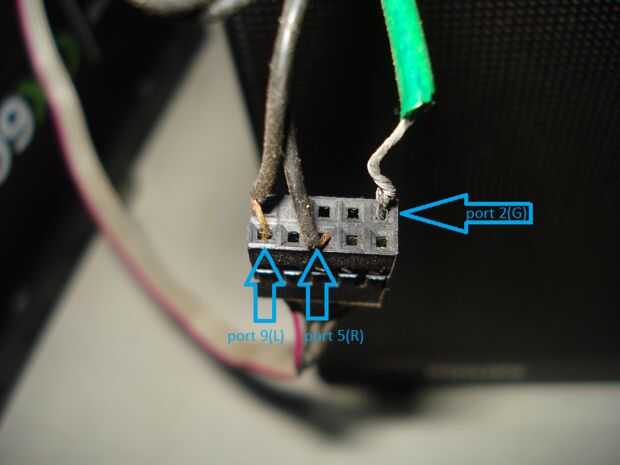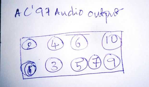El AC 97 audio cable tiene puertos 5 y 9 para la derecha y salida de señal de audio a la izquierda, emisor del transistor se conecta a estos puertos.