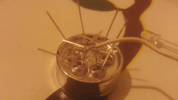Yo ya soporte para LED ' s pero puedes hacer uno con solo una tapa de plástico y un par de tijeras. Soldadura de resistencia de 10Hom para las piernas de cada positivo de los leds y luego soldarlos en paralelo, luego todos los negativos sin las resistencias. Utilice un cable para el positivo y otra para el negativo luego toman 2 pin y soldarlos a la led +,-termina el cable.
