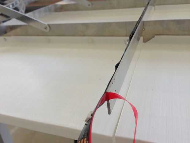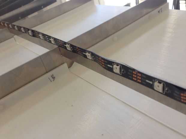 Una vez que todos los LEDs tenían VHB en ellas se les aplicaron a las nervaduras secundarias de la estructura. Unas pocas pulgadas a la vez desenrollaba la cubierta del adhesivo en VHB y presiona sobre las costillas. Se puede ver en la foto de arriba comenzó y terminó en el centro de la pieza para fácil conexión a la energía.