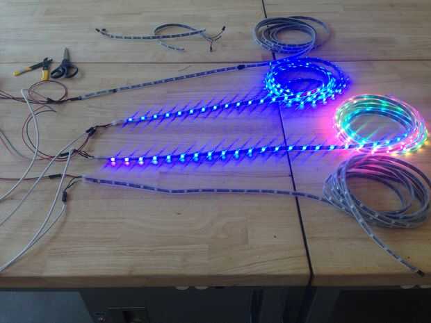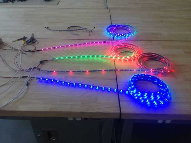 Una vez que las tiras se cortan a la longitud es tiempo de prueba del sistema completo. Conectar la primera tira completamente, use el script de Neopixel StripTester en arduino para probarla, necesita cambiar el número de LEDs y la asignación del pin.