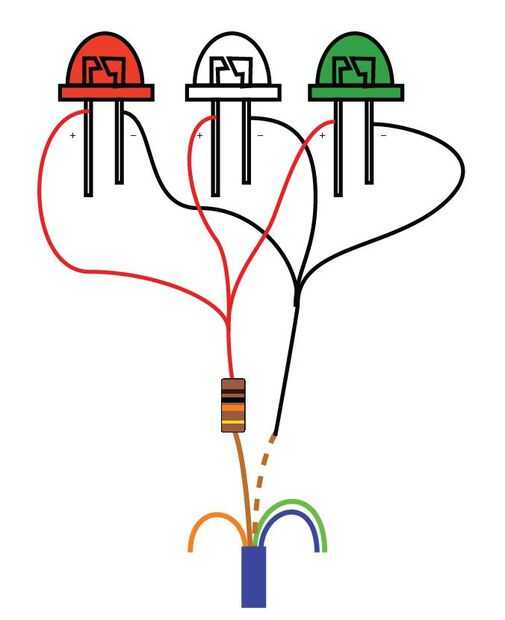 7. suelda el resistor de 1K en el extremo del alambre café. A continuación, conecte el cable rojo (a LEDs) para el cable marrón a través del resistor. El cable negro debe soldarse al cable blanco. Una resistencia no debería ir entre estos dos cables. Después de soldar, cubrir las conexiones con cinta aislante. El cableado debe ir bajo la hélice vertical para ello no se enrede cuando se acciona la perca de mar.