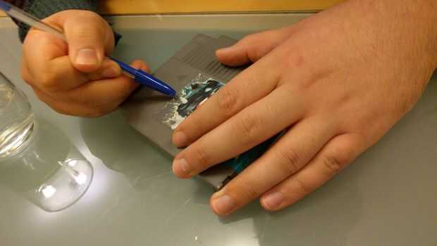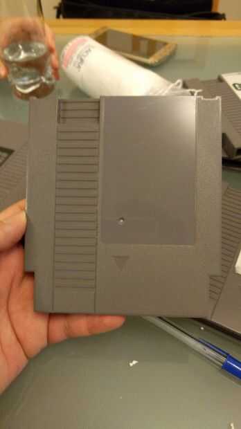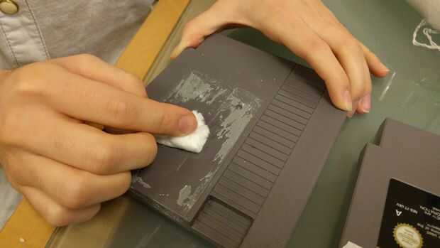 Inicio apagado quitando la etiqueta de su cartucho NES, esto puede ser difícil así que usé la tapa de un bolígrafo bic (desde su plástico más blando que el cartucho, no va a dañarlo) y algunos algunos 'remover materia pegajosa' que la mugre baje pero un poco de agua y un paño debería funcionar igual de bien con graves codo codo grasa (después de 20 años las etiquetas se pegan bastante en) , pero tenga cuidado de no adquirir la batería de mojado dentro aunque o podría explotar o tener fugas.