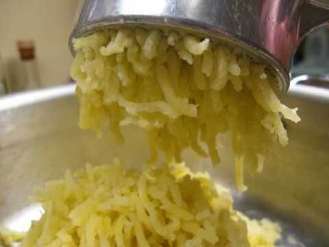 Escurrir las patatas y el arroz les mientras están todavía calientes.  (Si no tienes un ricer, puré las patatas hasta que hay no hay trozos izquierda.)