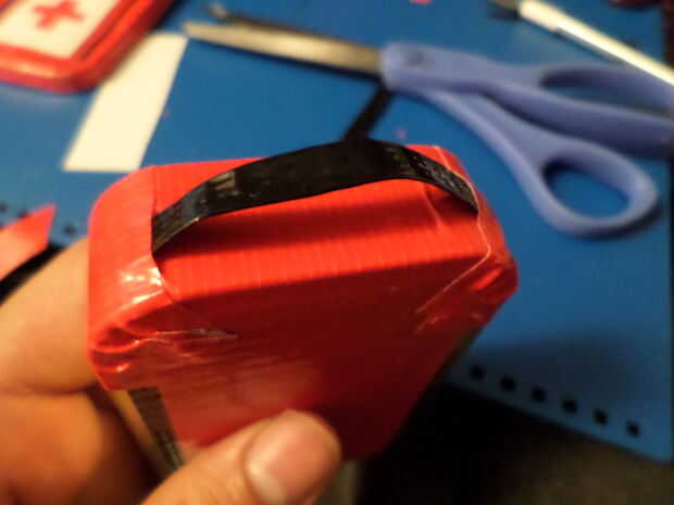 Después de eso, conducto de cinta de la parte inferior y cortar algunas pequeñas tiras delgadas de cinta del conducto como asas y les grabó al lado, como se ve en las fotos.