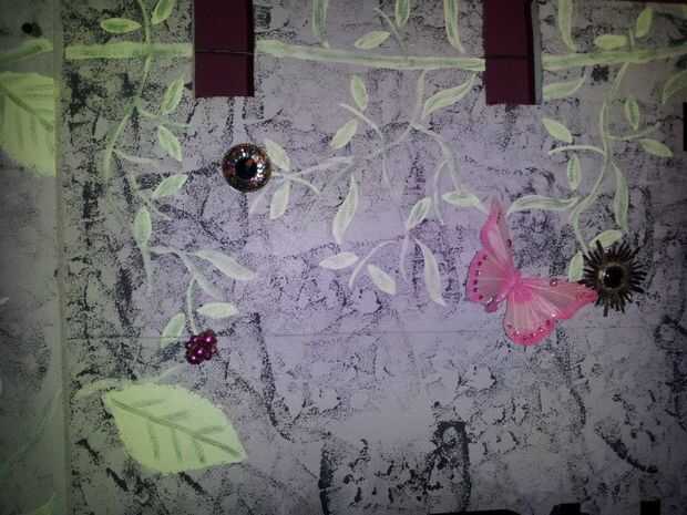 Puesto que cada castillo está cubierto de viñas, usé otra esponja cortada en la forma de una hoja y pintada en lugar de esponja. La vid entre las hojas se realizó a mano alzada. Yo también quitó las espaldas de algunos bisutería y caliente pegado a las paredes para darle un toque más "girly".