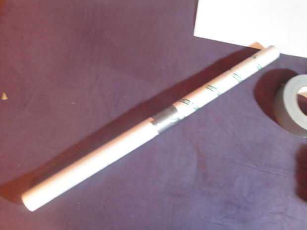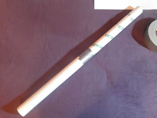 Simplemente cinta adhesiva los dos rollos juntos (ver foto) y luego cubren con la etiqueta-papel-materia pegajosa. (si hay arrugas en él, está bien, hace se parecen más a un palo.)