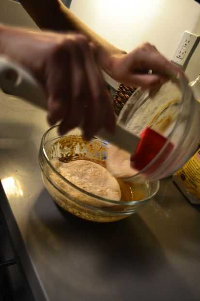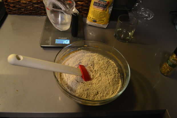 Para hacer opara, combinar las dos masas, agregar 150g de harina de centeno y agua a temperatura ambiente 150g. Obtendrá una masa casi tan gruesa como nata agria. Cubra con envoltura de plástico y deje reposar por 4 horas más en el horno con una luz en (o a unos 85-90 grados F).
