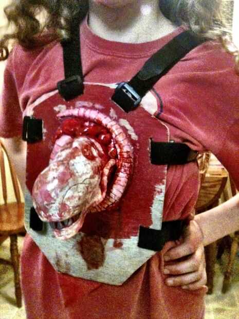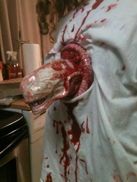 5. en Halloween, ponga la pieza principal de después la camisa sobre él. Si la camisa se cierne sobre el extranjero, sólo caliente pegamento la camisa alrededor de los bordes de donde se muestra al extranjero. Asegúrese de que ninguna madera es visible a través del orificio, si es así, pintura roja. Porque el efecto secundario de tener un chestburster son Sangranarices sangre, que se vea como es verter de la sangre de su boca. También, hacer arañazos en tus mejillas para agregar el efecto de facehugger. Por último, verter sangre en todo el extranjero y los alrededores. TA-daa!