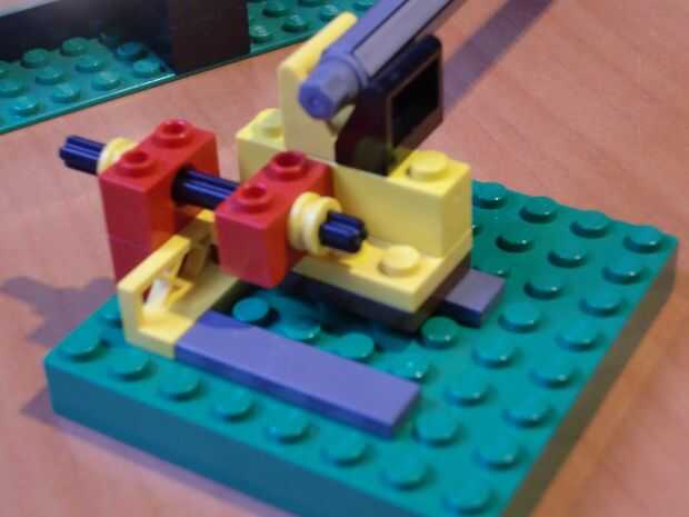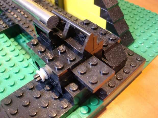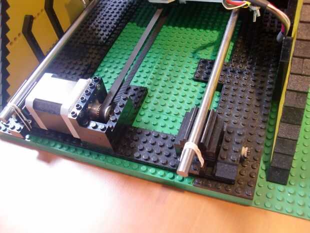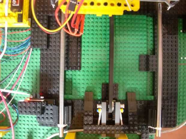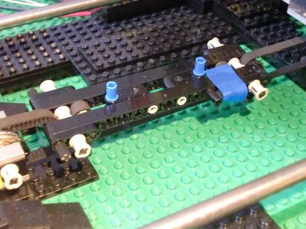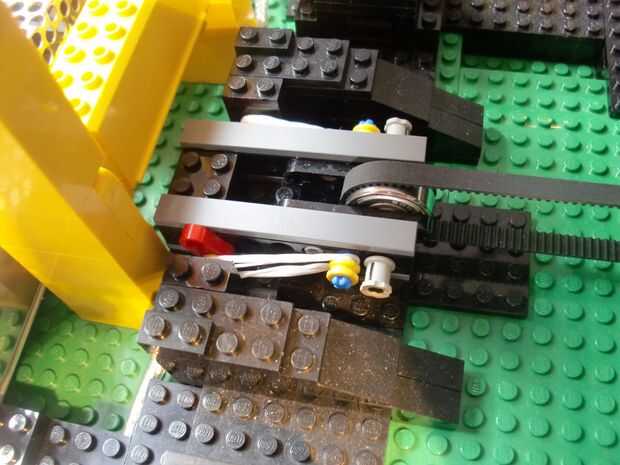 El Motor se coloca con técnica ladrillos en la parte posterior de la máquina. La polea está conectada al motor. El soporte de cojinete en el otro lado es ajustable. Utilizar bandas de telar para tensar la correa dentada en el lado del cojinete (imagen 4). Coloque estos telares después de conectar la correa dentada en el carro de LEGO.