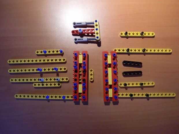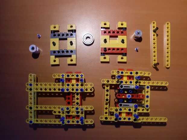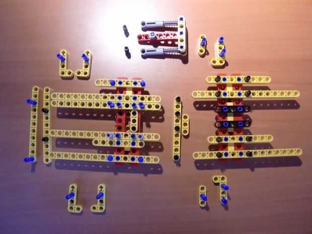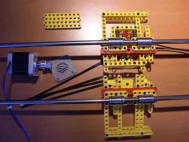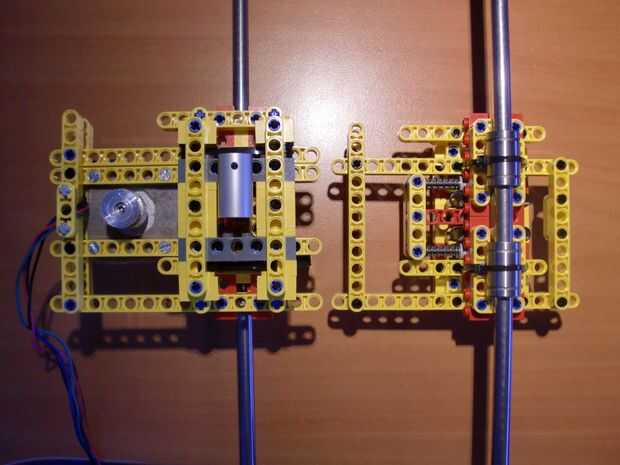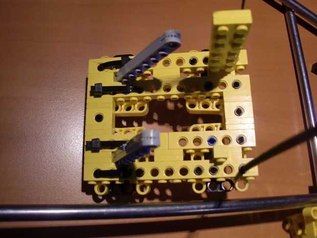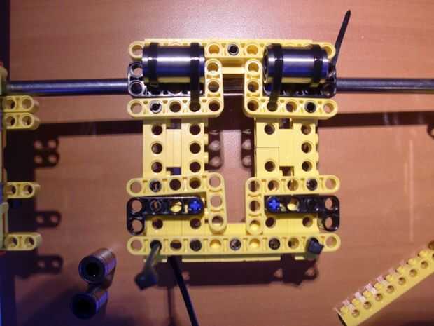 En mi primera versión del eje x, las varillas lisas descansan en los postes de ladrillo. Ahora las barras lisas del eje x están descansando sobre nuevos ladrillos Technic, resultando en un mejor eje x. Porque las barras se unen (telar de bandas) a las vigas technic, no hay necesidad para conectar te izquierda y derecha del eje X.