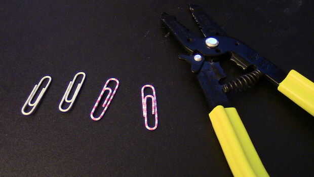 Bueno, mi sujetapapeles tienen recubrimiento plástico. Plástico no conducir la electricidad así que vamos a tener que quitarlo. En primer lugar enderezar los clips y los peladores de alambre para quitar la capa.