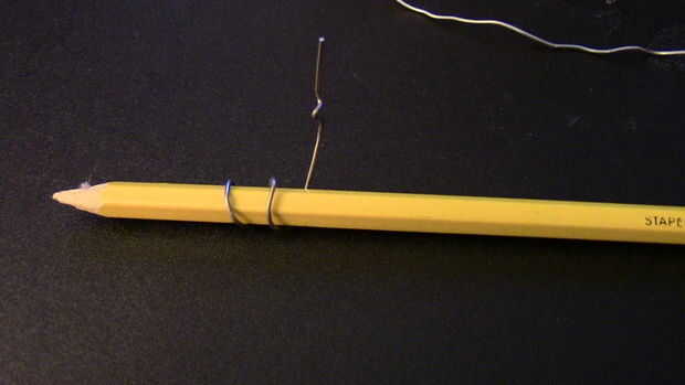 Vamos a hacer algo como esto. Uno de los cuatro clips y Envuélvala alrededor de un lápiz como un resorte. Dejo algunos de lo clip recto. (Ver las fotos de arriba) Cuando retire el clip del lápiz será bueno fuera como un resorte. Ahora repita este paso con un otro clip.
