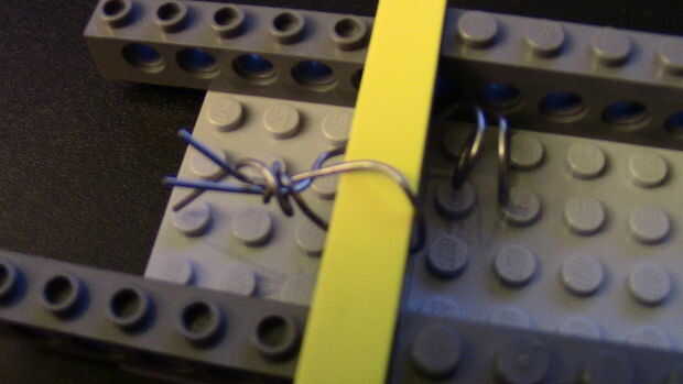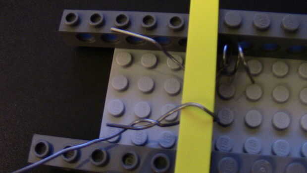 Cada lado de la caja de lego tiene un resorte clip cable y un alambre de clip recto. Trence ambos en un lado de la caja de lego. Esto hará que las dos baterías conectadas en serie.