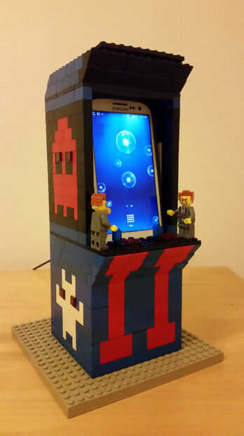 Después de muchas horas sentado en la caja grande de Lego que tengo para que los bits construir este salió mejor de lo que imaginé. No tuve ningún plan real para él que no sea ser un arcade de la máquina. Los diseños - Pacman, los fantasmas, el etc. de invasores del espacio - se agregaron en cuando fui a lo largo. Las columnas rojas en la parte delantera y trasera salieron de necesidad de correr bajo en partes azul.
