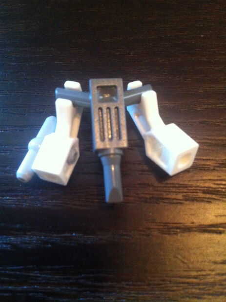 Haz tu taladro y añadir brazos robot en la misma. Poner una barra en el orificio de la muñeca del brazo derecho. A continuación, poner un poste agujereado en la parte superior 5 tachas 1 x 1 y añadir en. Agregar un clip en el agujero de la mano derecha.