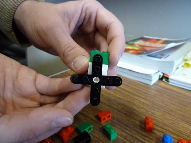 Luego, tome dos de las piezas de 1 x 2 y fíjelas a la parte superior de la pieza de accesorio rotatorio de la hélice, creando una pila de tres 1x2s total, como se muestra.
