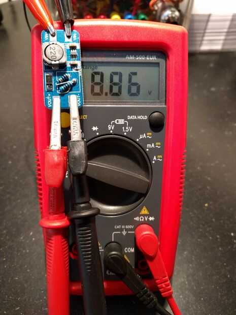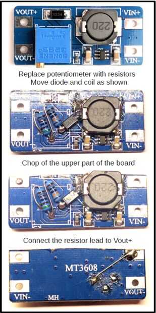 La salida del convertidor boost se puede ajustar con el potenciómetro a bordo, pero es bastante grande, así que vamos a empezar por cambiar esto. Desolderlo y sustituirlo por el resistor de 5k y 100 k, como se muestra en la imagen. Cuando mida la salida, debe moverse de 9V.