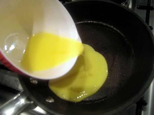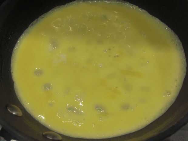 2. Para la capa amarilla, batir el huevo y fino extendido sobre la bandeja caliente. Cocinar por 2 minutos y llevarlo a un lado hasta que salga fría
