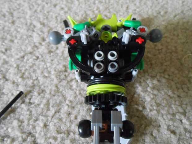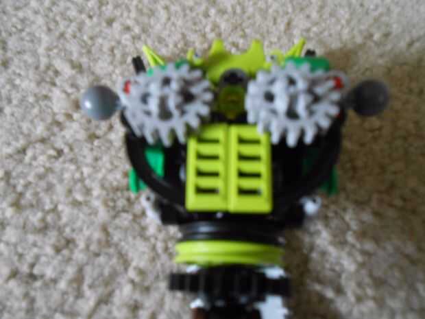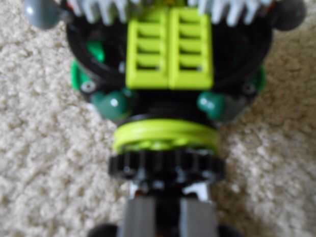 Cortar una tapa de tres ejes donde un buje media caben allí. Aquí le damos la siguiente parte compleja. Será difícil conseguir el cabezal de aire (completo buje onone final y el medio y el final son conectores). Añadir pistas de la ventilación y pone los engranajes en el pecho. Y añadir brazos minifigura en la parte inferior de la parte superior del cuerpo. Se verá como eso es el final de la caja torácica, especie de.