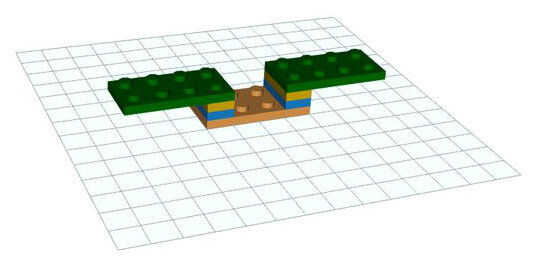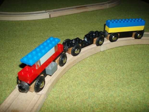 Se colocan juntos de los dos bloques de madera 10 x 20 x 24 mm que llevan cada uno un par de ruedas y un imán y siete piezas de lego. Las piezas de lego son 2 x tres 4 placas y placas de 1 x 4 2. que pegan permanentemente con superglue.