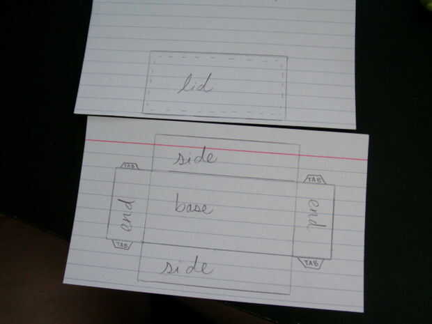 Su objetivo es tener algo que puede trabajar desde que le dará una forma de abrir la caja. Trazó también un pedazo para hacer la tapa (del mismo tamaño que la base) porque quería que se ajuste realmente al resto de la caja. La línea discontinua en la plantilla de "tapa" es sólo para dar una idea aproximada sobre donde irá la pieza de soporte de tapa más tarde.