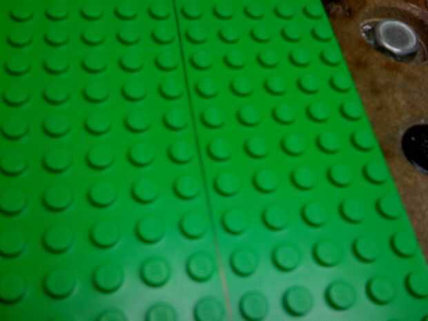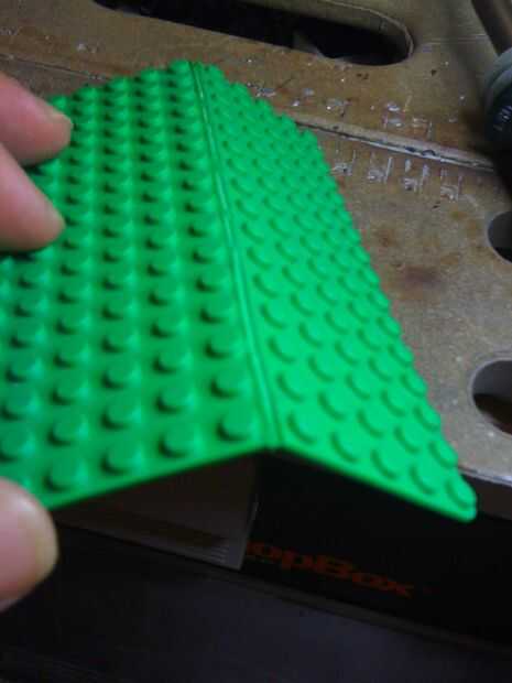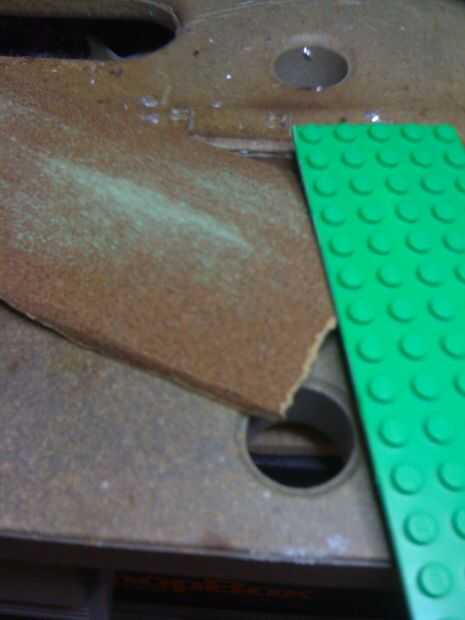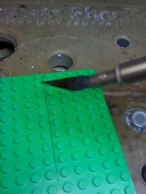 Los otros cuadros de esta serie muestran el proceso de cortar la placa a la medida. LEGOs se derriten muy fácilmente. No puedo advertirte lo suficiente, o decir esto demasiadas veces - Tómese su tiempo y corte a través de la placa un poco a la vez. Si arrastra la hoja demasiado lentamente terminarás con un pedazo de tabaco deformado, torcido, de plástico en su banco de trabajo. Lo sabrás cuando ha cortado la mayor parte de la forma a través de cuando usted comienza a ver una línea de corte en la parte inferior de la placa como se muestra en la cuarta foto. En este punto puede doblar la placa hacia adelante y hacia atrás en el corte un par de tiempo y vendrá aparte limpio. Alise el borde cortado con un pedazo de papel de lija.