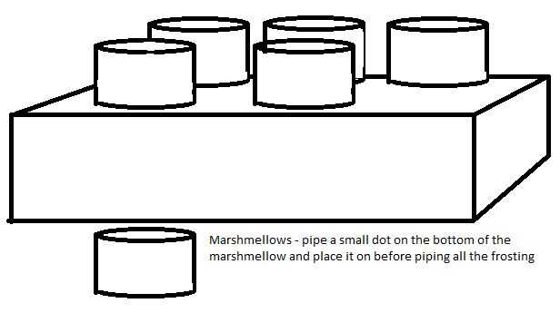 Simplemente la pipa la torta entera y malvaviscos. Utiliza colores brillantes para que pueda obtener esa sensación de bloque Lego. Este pastel se realizó para un cumpleaños así que el nombre del niño se canaliza en, pero usted podría tubo en todo lo que quieras la torta que decir o nada en todos.