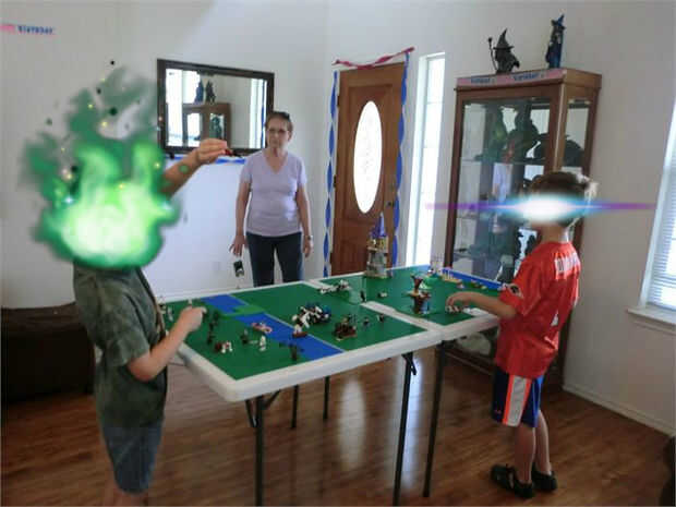 El curso de obstáculo fue construido y preparado en el patio trasero. Sin embargo, como los niños llegaron para el partido no quería subir por todas partes. Hemos querido mantenerlas separadas del curso por lo que sería una sorpresa cuando fuimos fuera. Así, en el interior, teníamos jugando con un par de cubos de Legos y dos mesas plegables de Lego (parte de mesas de instructable se separa). Para que las mesas de Lego entretuvieron a los niños en el salón delantero hasta que todos ellos llegaron. Luego entró en el patio y comenzó los ensayos de tiempo.