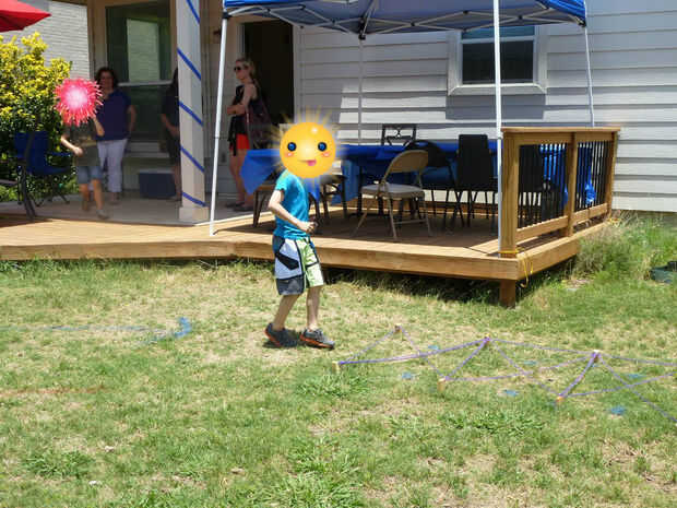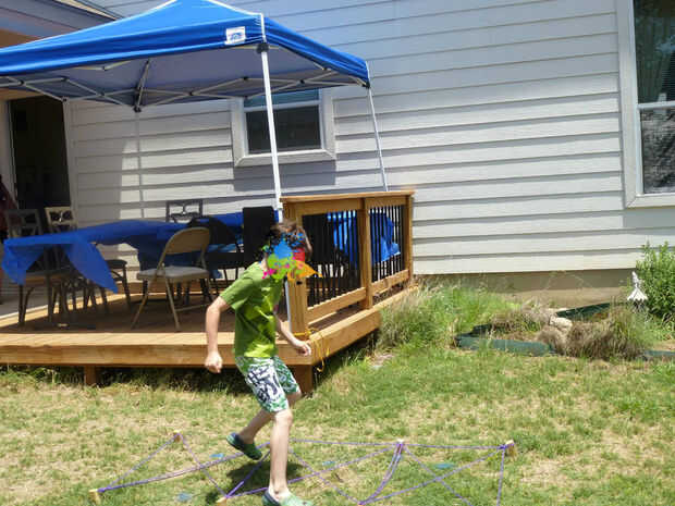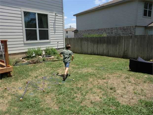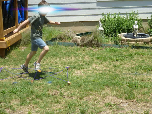 No tenía ningún neumáticos para usar usar para los niños, poniendo sus pies en cada neumático como funcionaron. Por lo tanto, hice 8 estacas de madera que hemos golpeado en el suelo pero de 5 pulgadas a la izquierda por encima del suelo. Taladré agujeros en cada estaca, rand algunos de alambre por el orificio, funcionó el alambre a través de una arandela de 1", entonces funcionó cuerda púrpura a través de cada arandela (lo siento no hay fotos de eso). Enrollé la cuerda alrededor de las estacas para crear un obstáculo para los niños correr a través.