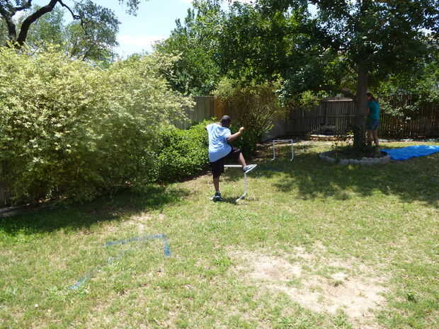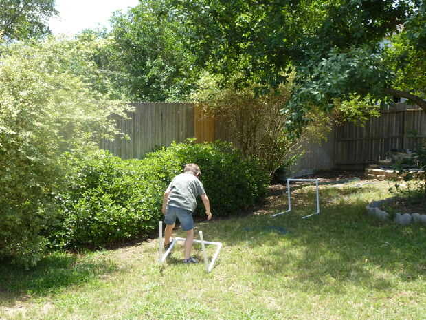 Los obstáculos eran muy fáciles de hacer. Tomé 3/4 en tubo de PVC y cortar 5 secciones de 24" cada uno. Entonces usé 4 codos para configurar un obstáculo. Originalmente quería hacer los soportes de pie va hacia afuera de ambos extremos de la valla. Sin embargo, después de mirar por internet me di cuenta de la gente sólo tenía los soportes de pie en un lado. Finalmente se hizo evidente para mí por eso... cuando los niños saltan sobre el obstáculo, si pierden, el obstáculo se diseña para caer. De lo contrario, el obstáculo hasta y viaje de los niños haciéndolos caer sobre sus caras. Así, los obstáculos tienen dos pies apuntando en una dirección. Los pies se colocan hacia el funcionamiento del cabrito así que si el niño pierde, el obstáculo será caer pero no viaje nadie.